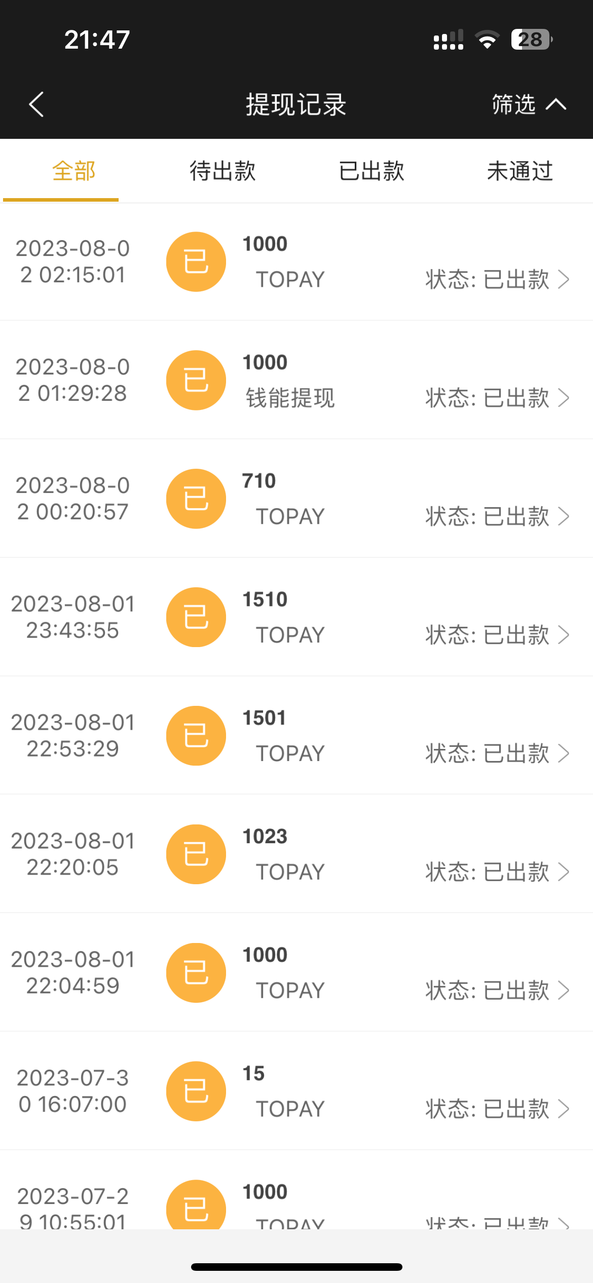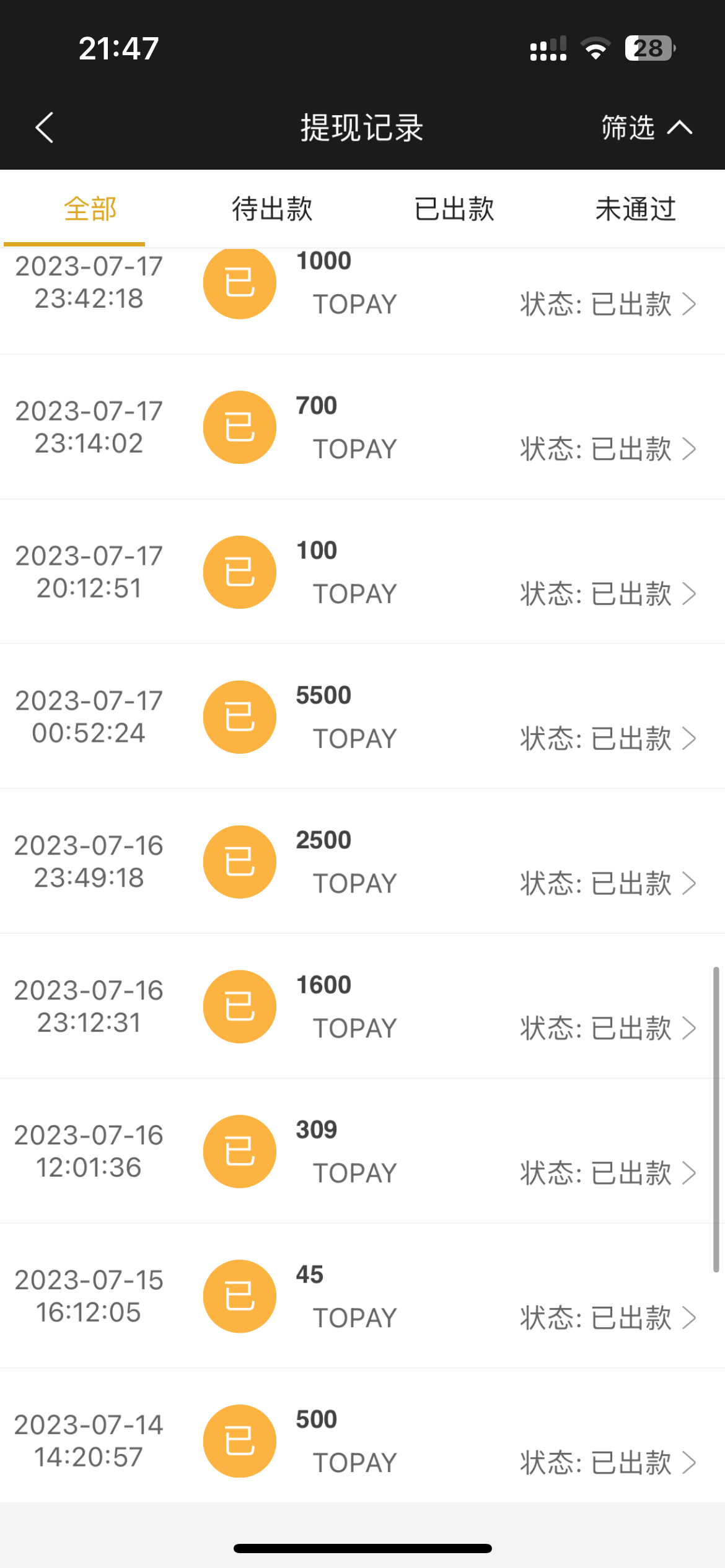 倒下了虽然知道他是黑台但每次给我提现秒到账这两天几块钱打出700多