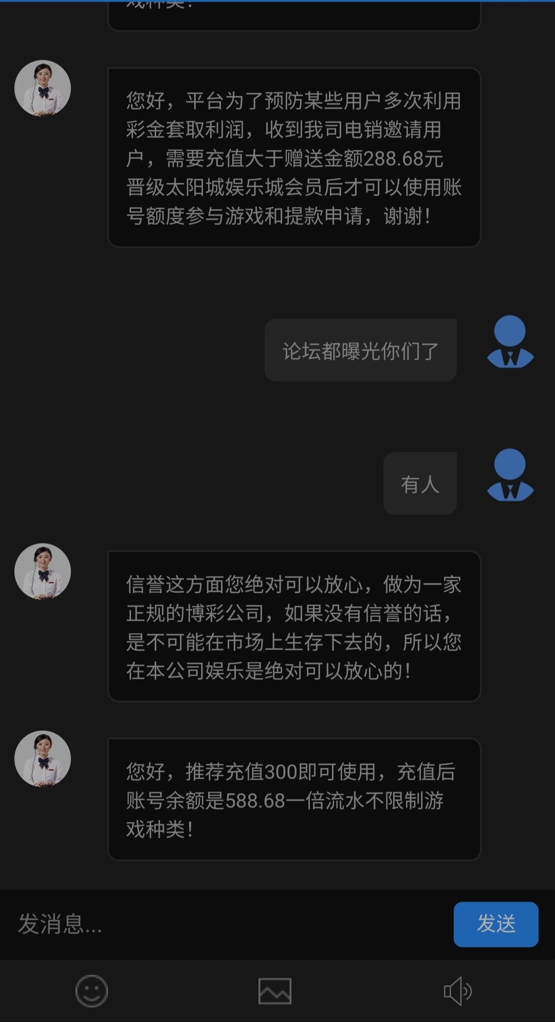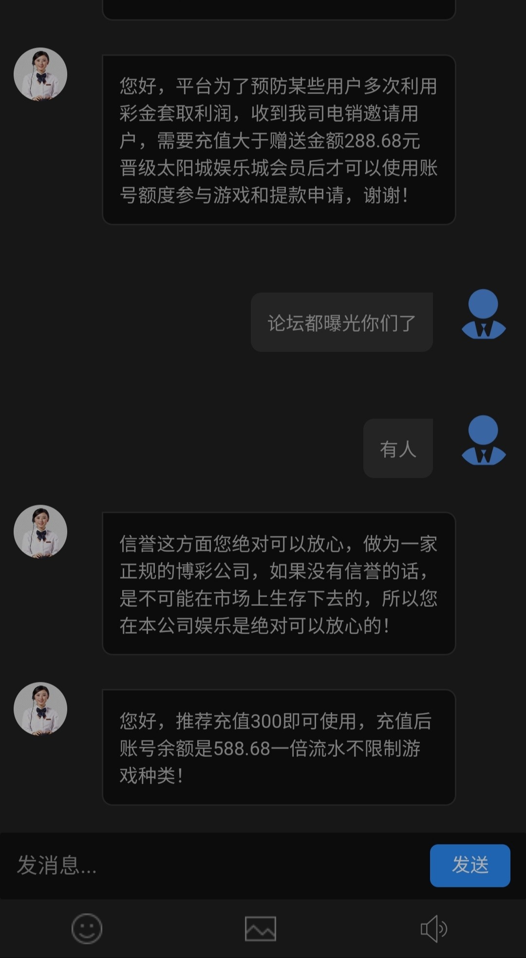 打电话说合并彩金已注册就给了288