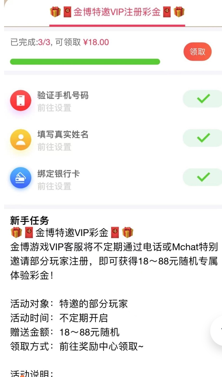 活动:注册绑定个人消息右下角有个新人福利点进去领取18—88彩金大部分人都有
