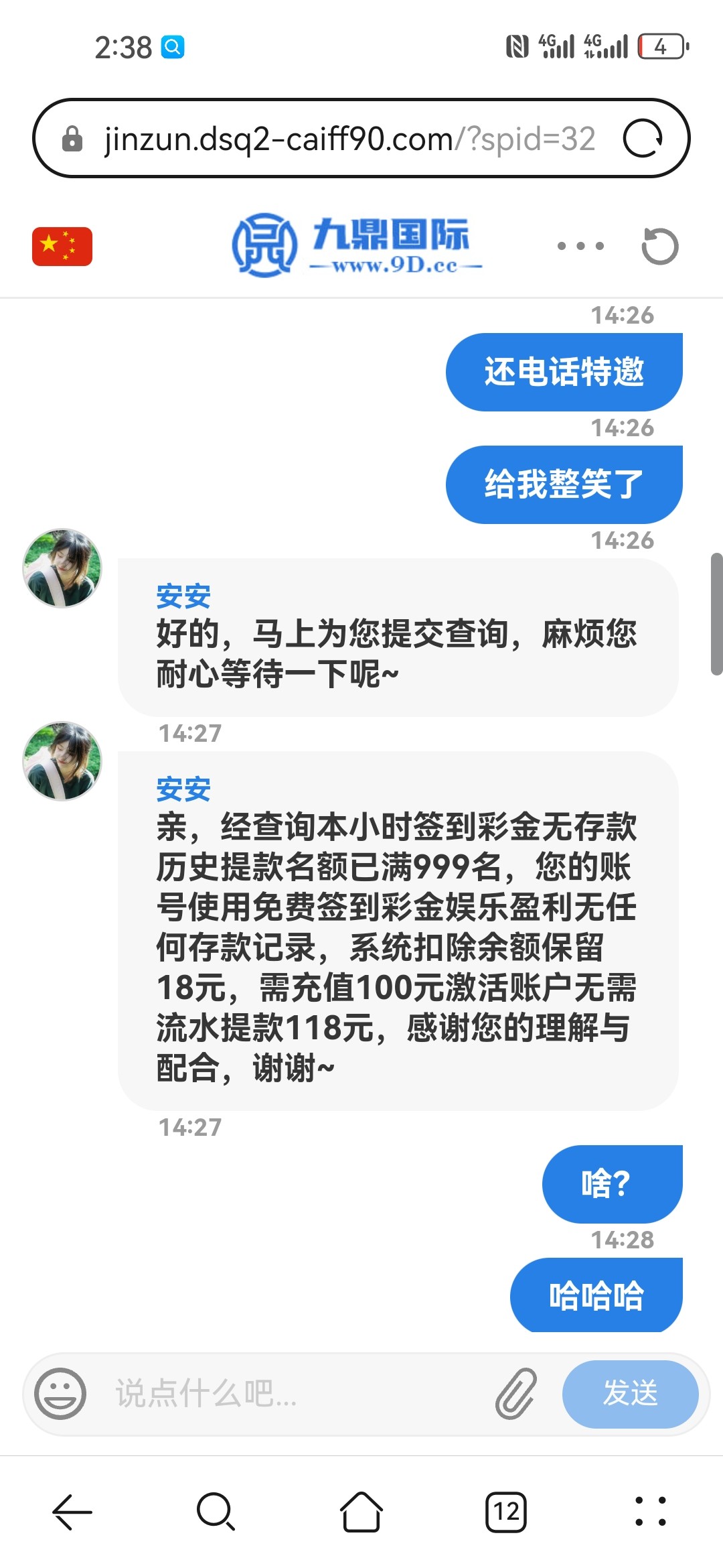 打电话来的送18,提现退回彩金