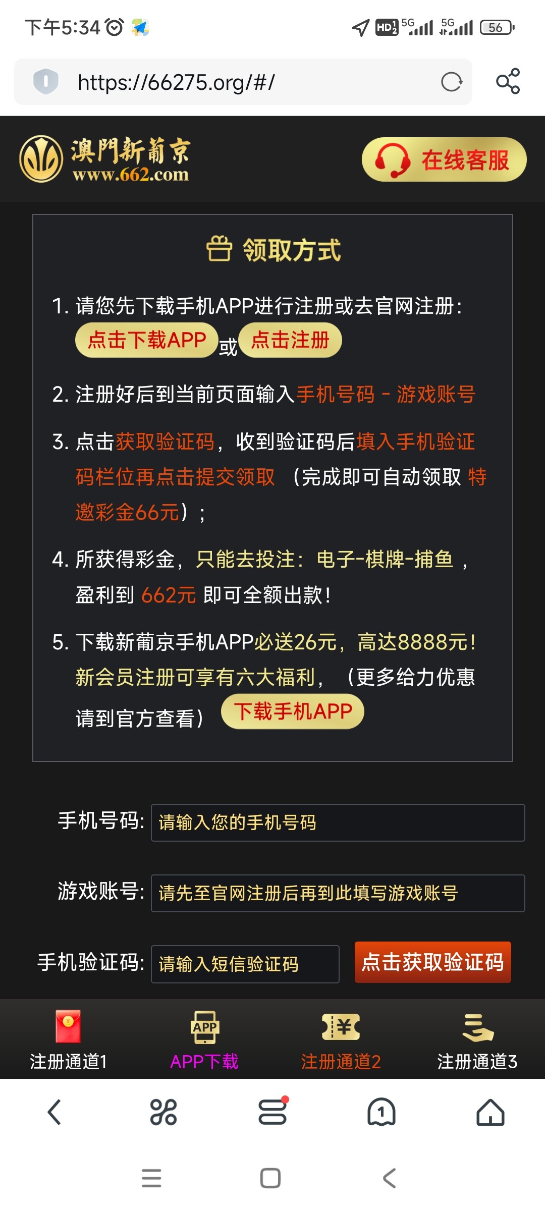 662特邀送66(注册好账号后然后在联系方式哪里绑定手机号,多老油条号都能领到)只有一个号那种,充值过,提现过估计不会挨黑。想的可以死马当活马医试试。我tm自己用撸彩金的号挨黑了擦。太恶心了。(彩金链接要是打不开,用uc可以打开)打到不给提,擦他m的662,必输了还难受,骂哪玩意客服也没吊用,唉