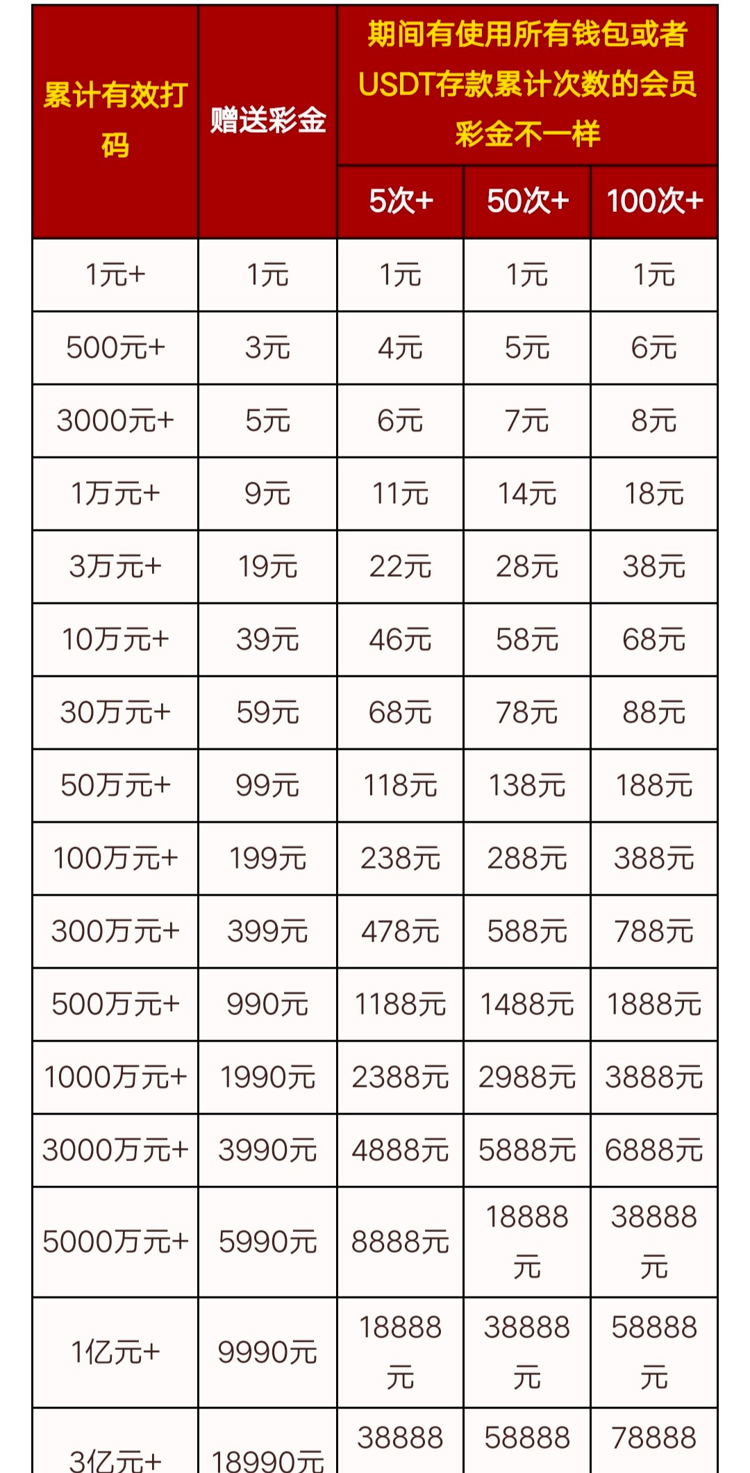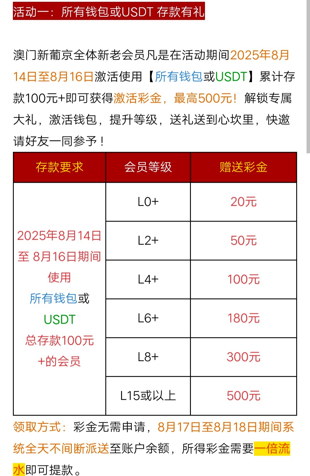 8月14日—8月16日,使用【所有钱包或USDT】累计存款100元+即可获得激活彩金,最高500元!彩金无需申请,8月17日至8月18日期间系统全天不间断派送至账户余额,所得彩金需要一倍流水即可提款。
