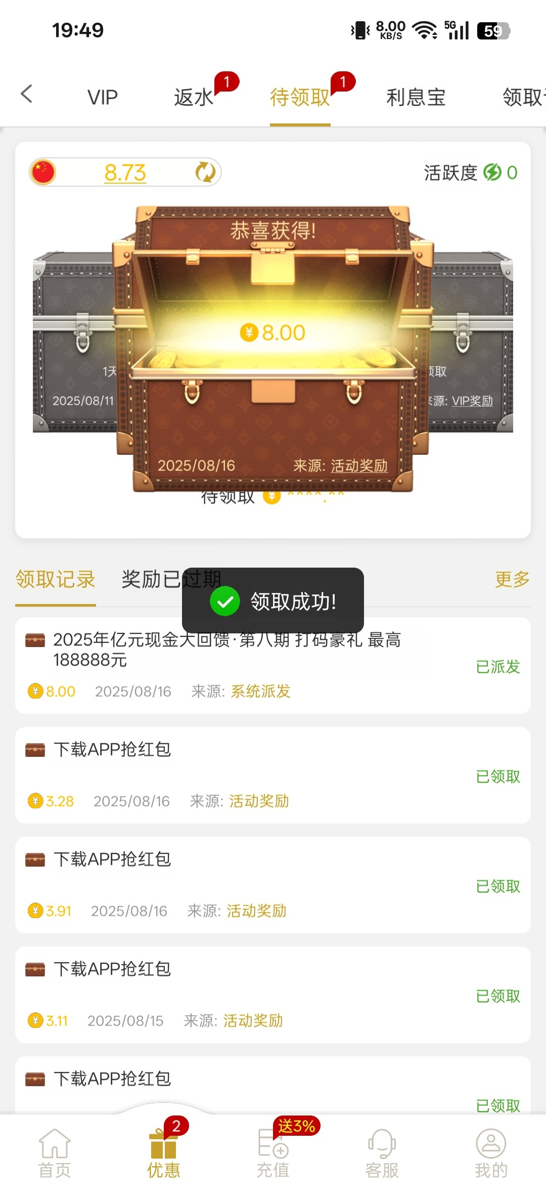 回馈彩金期间打码1+就有,我领的8快,有号的去看看,没有无视。