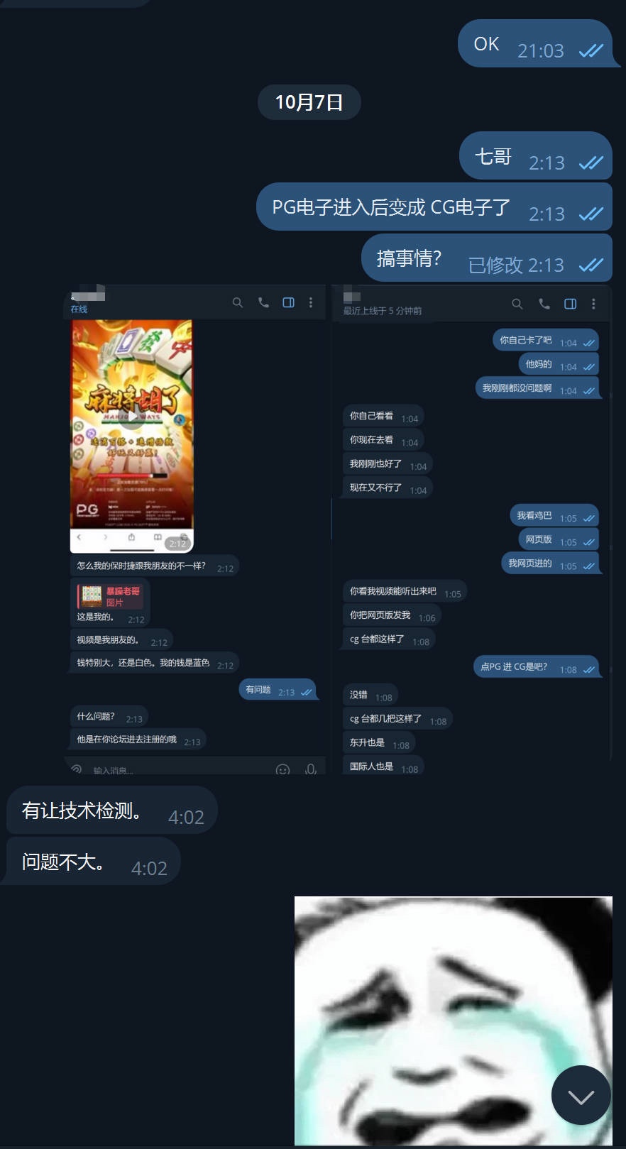 不少人和我反馈CG模版的平台里面的PG部分游戏模版和之前的PG有点差异,PG接口出错调成CG电子了,玩的是CG电子并不是PG电子,牌子不一样理性看待,不用纠结什么真PG假PG。如果大家非常在意这种,可以在娱乐WG模版的PG游戏.也可以娱乐其他电子游戏. 目前只有CG模板出现这个问题,不止一个平台;WG系列的模板一切正常 没有问题。