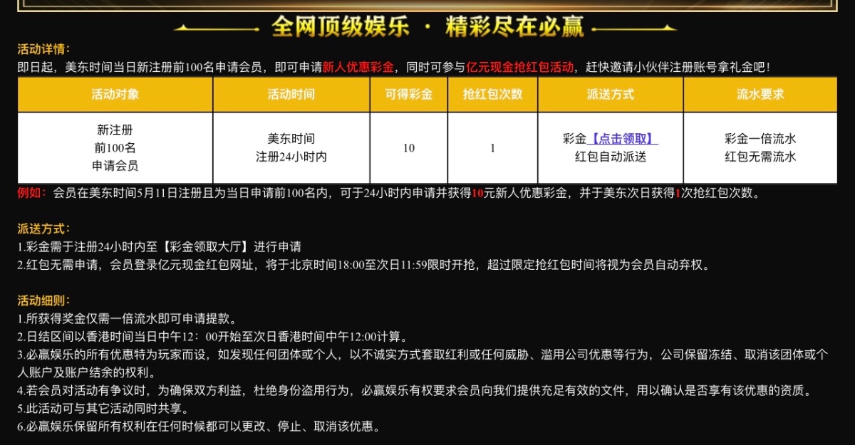前100名送10元彩金,注册后24小时之内申请,第二天获得一次抢红包机会