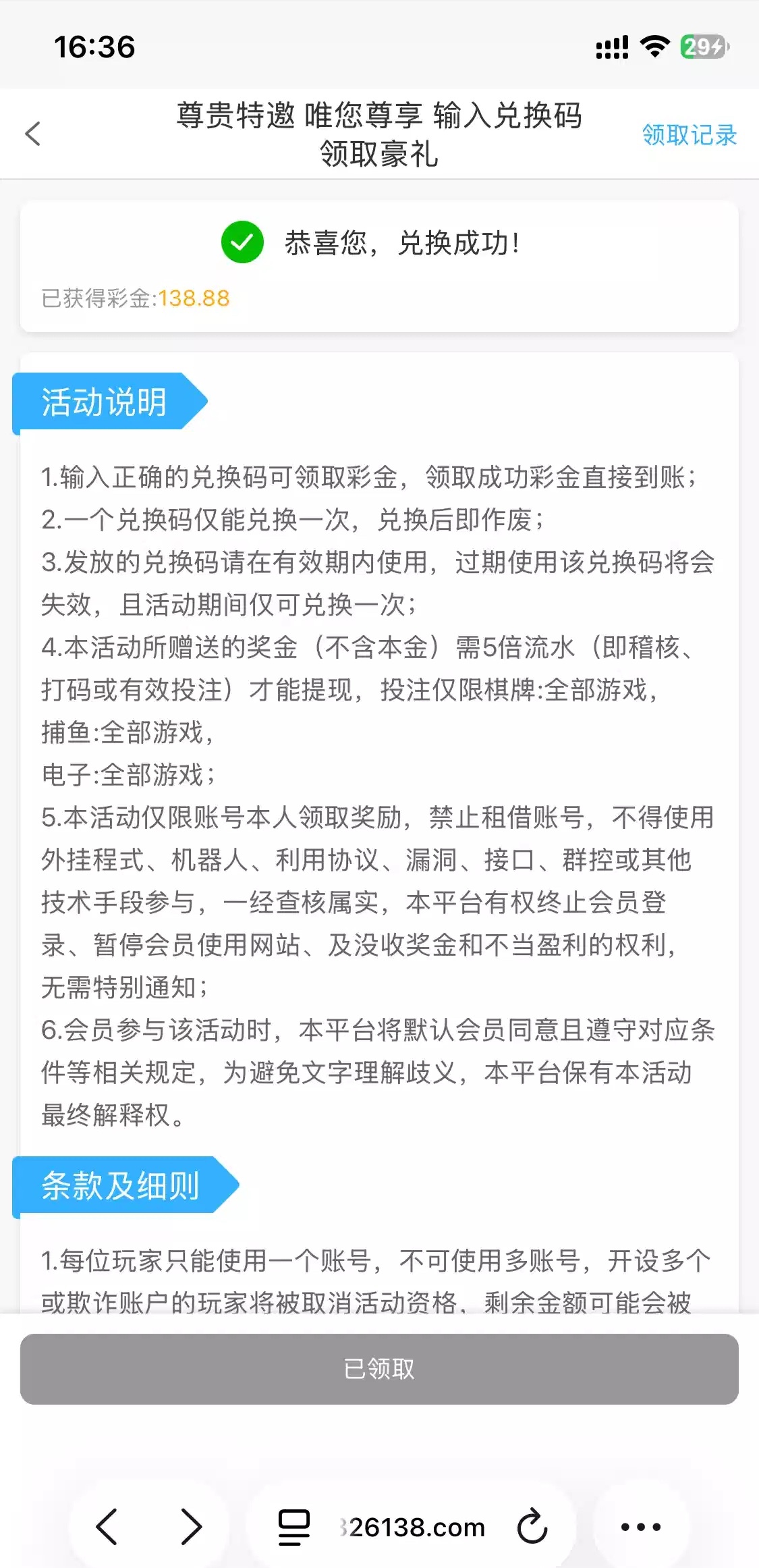 地址 6138.vip,在合营其他平台有等级可以平移找客服领兑换码,我pgvip等级4,给我兑换码领了138.88,没打出来,活动需要两个平台账号一样,新注册的领不了,符合的去吧,不符合别去碰了,碰不到,图片有链接