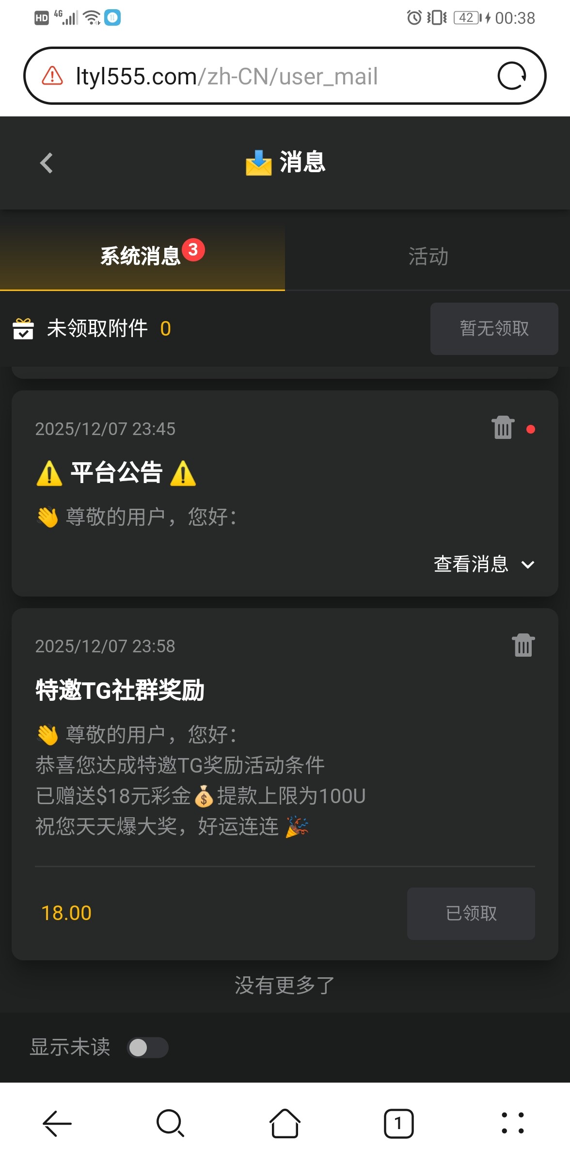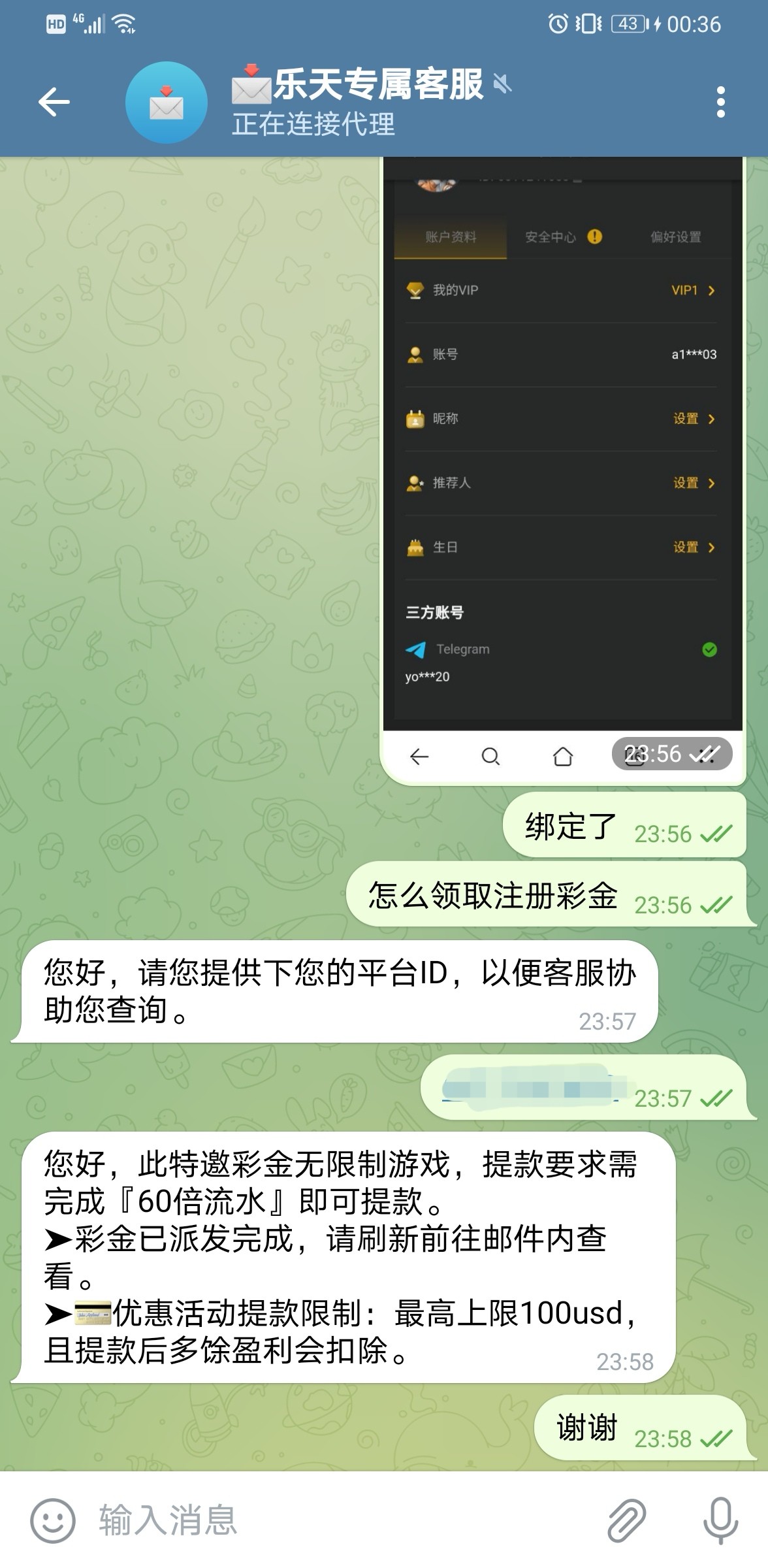 注册完后根据客服要求操作 绑定飞机号送18u 此彩金无限制游戏,提款要求需完成『60倍流水』即可提款。最高上100usd,且提款后多馀盈利会扣除,我4个飞机号都领到了 没打出来