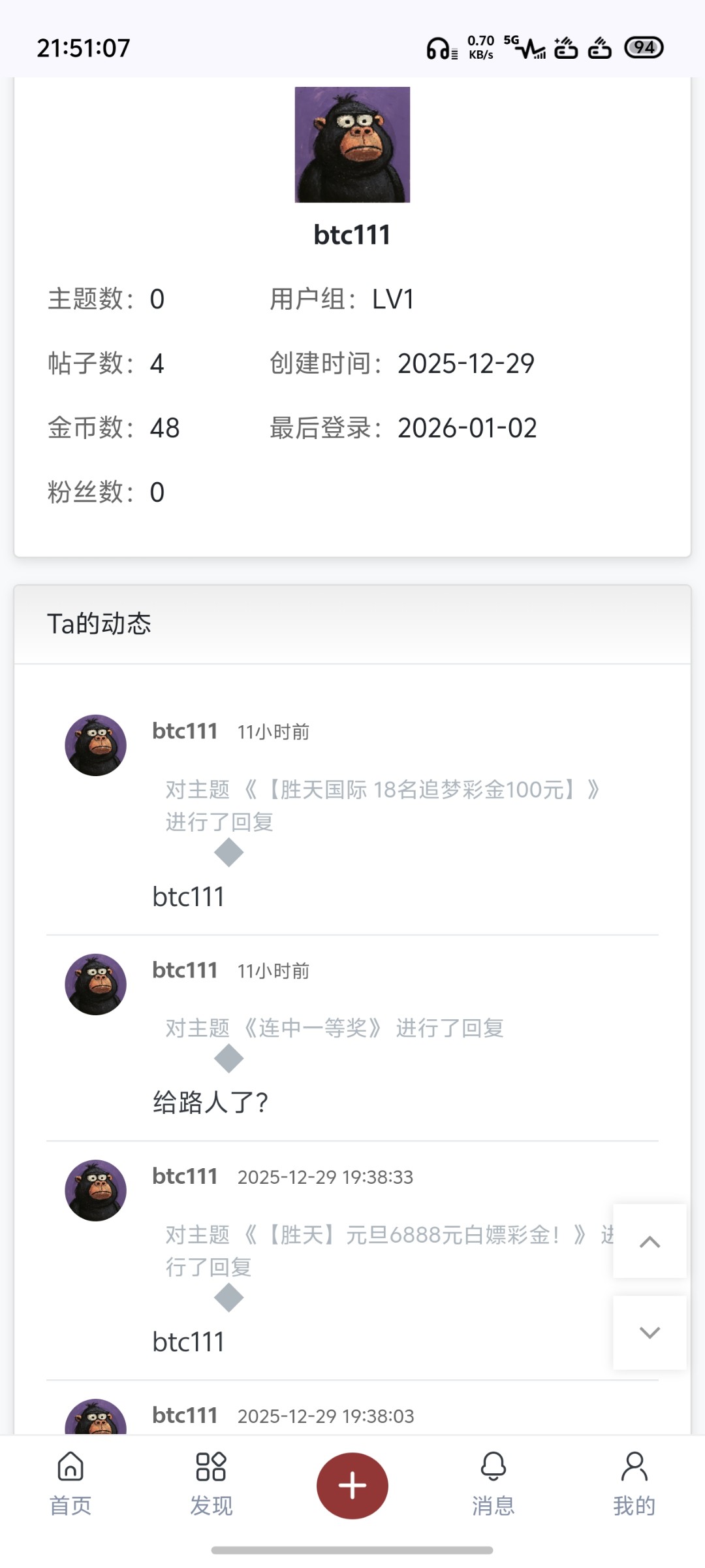 我是22号刚加的蛋蛋 然后注册了论坛 今天中了胜天追梦