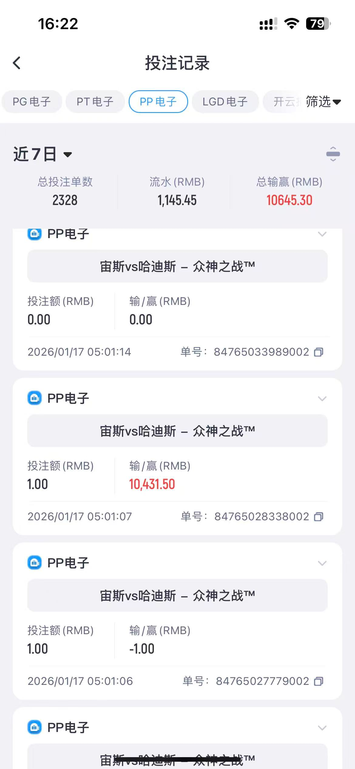 难说,我一样在pp买了不知道多少回,亏的也多,几百倍千倍,都有过,最大就六千杯,四千倍,总的就是买亏的时候就是一直亏,换游戏买也是