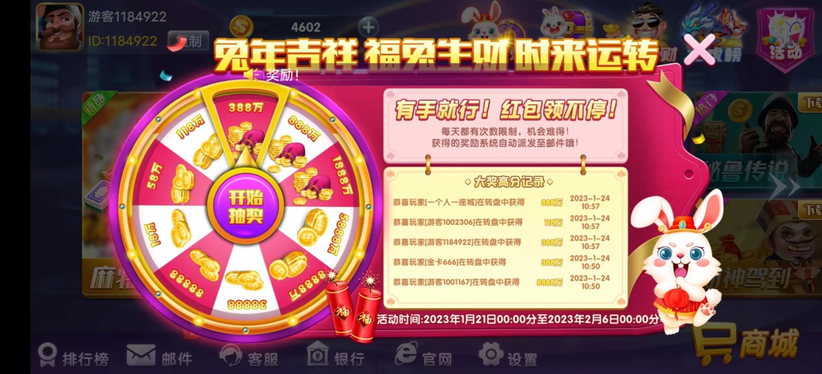 活动:1.21-2.6可以玩转盘免费领彩金,下分比例问客服吧
