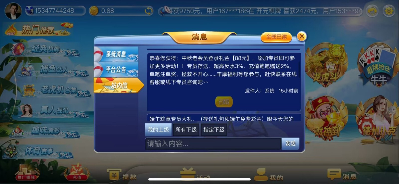 老用户有号的登陆站内信看看中秋节部分回馈88