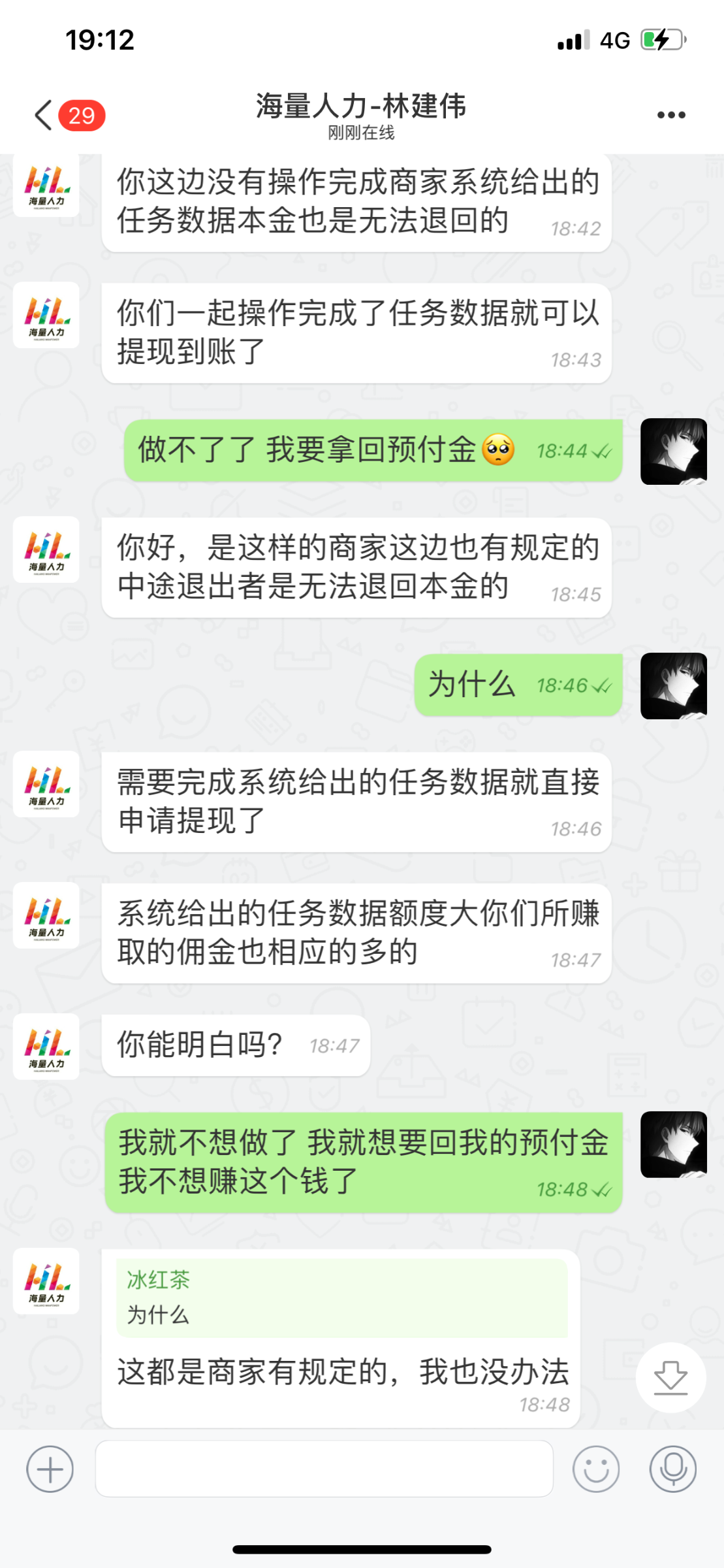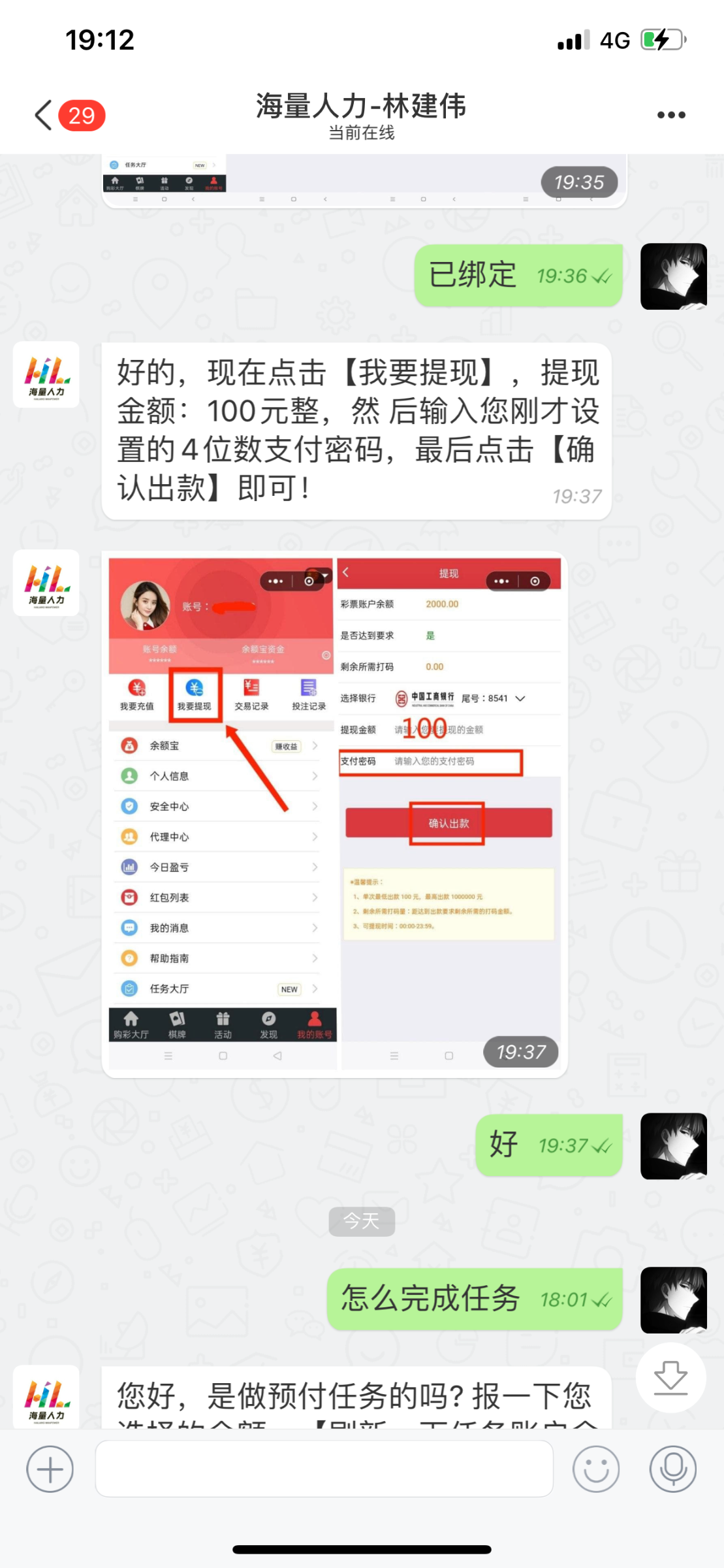 这是一个做任务的群 就是搞赌博的 刚开始赚了58块钱 然后叫我充53进去 赚了一百块 第二天我跟上任务要我充300预付金 后面就开始套路了 要我充值2k 有没有大哥敢上的 我只想要回我的300块