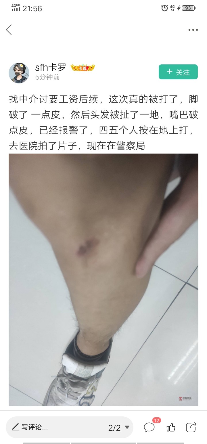 当时没还手,然后不想干了,找中介要工资,又被几个人按地上打了一顿,连同医药费赔1000,我自己验伤时花了300,今天白嫖700,美滋滋